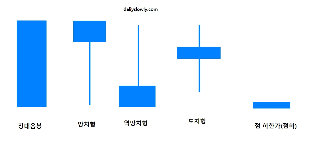 양봉(시가보다 종가가 높게 마감)과 음봉(시가보다 종가가 낮게 마감)에 따라서 해석이 달라질 수 있다는 점을 주의하셔야 합니다.