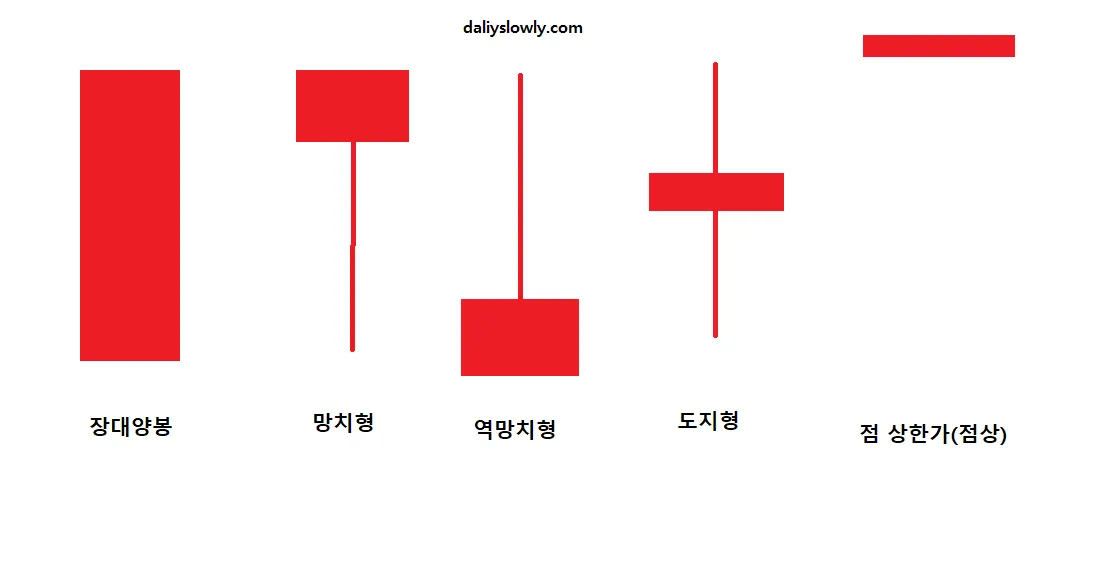 우선 양봉캔들을 보시면 5가지의 모양은 위에 처럼 알아보실 수 있는데요.